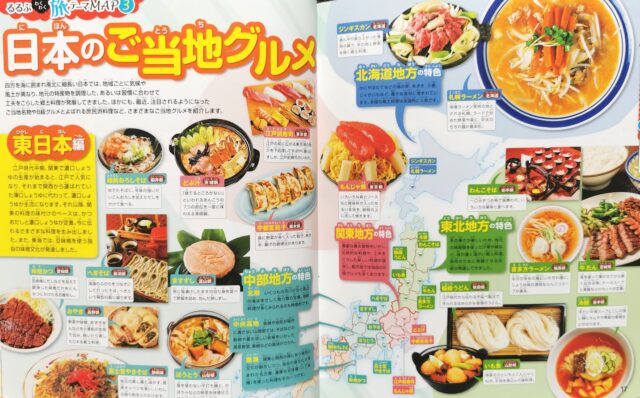 各都道府県の特産品をイラストで掲載されており、県庁所在地や全国10位までの山や川、湖の情報もあります。